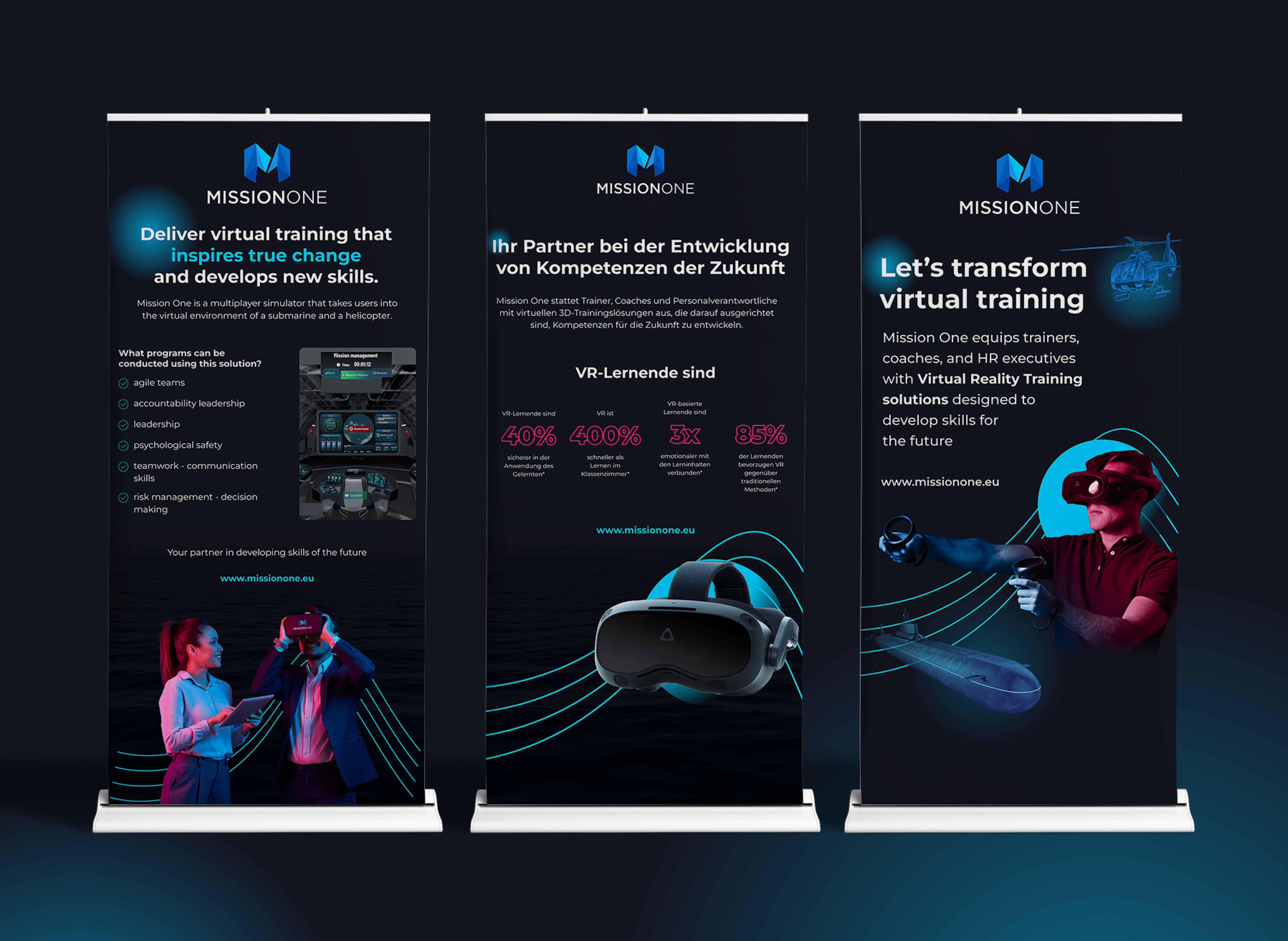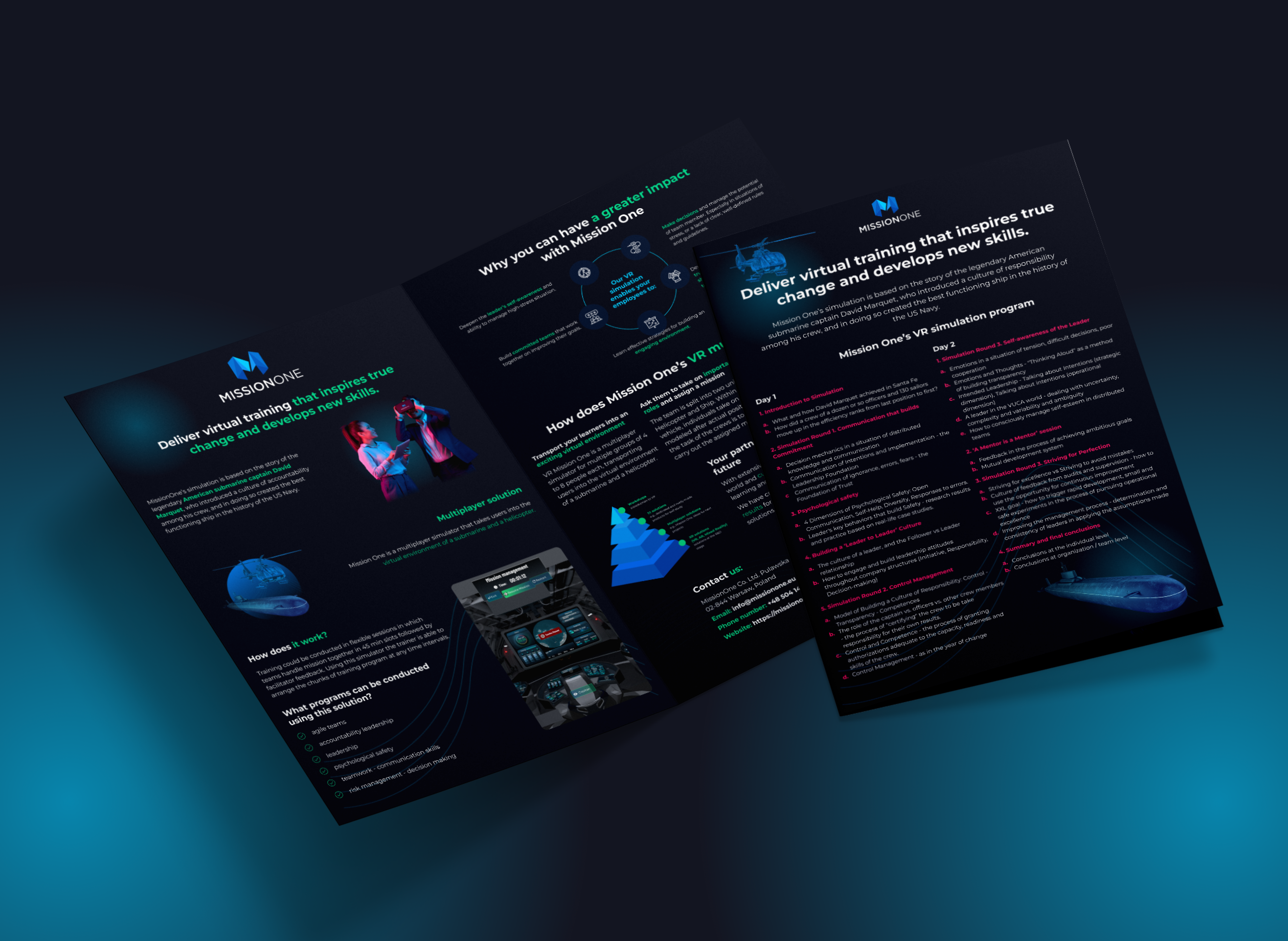 Produktem Mission One jest autorska symulacja dedykowana liderom oraz ich zespołom. Dzięki zastosowaniu gogli VR i wspólnie przeżytej przygodzie na pokładzie helikoptera lub łodzi podwodnej, uczestnicy szkolenia trenują kompetencje miękkie, doskonalą współpracę i odkrywają indywidualne obszary do rozwoju. Mission One to nie tylko okazja do integracji, ale też cenne narzędzie do pracy nad swoim stylem zarządzania i komunikowania się.